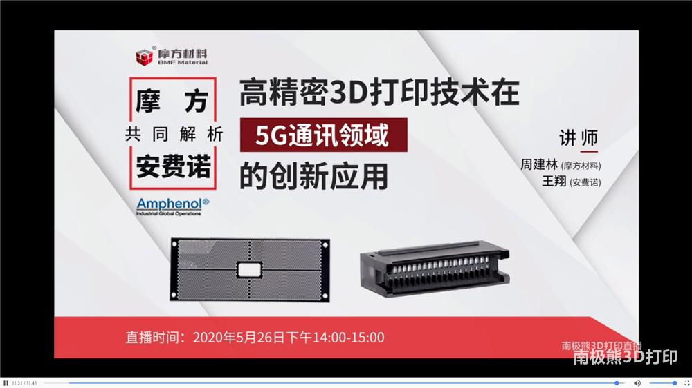 2020年5月26日下午2点,摩方材料联合安费诺集团在南极熊平台上开展了一场直播,主题为“高精密3D打印技术在5G通讯领域的创新应用”,本场直播由摩方材料周建林先生和安费诺王翔先生主讲。
