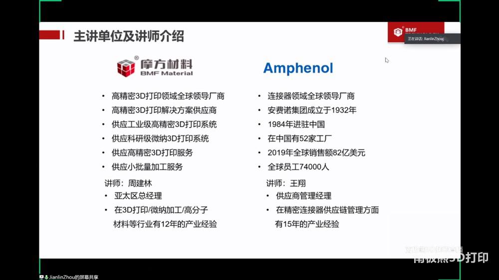 下面南极熊就带大家以图文的形式来回顾一下本场直播的部分内容,首先我们来了解一下本次直播的两家公司背景以及两位主讲人。摩方材料是高精密3D打印领域全球领导厂商,安费诺(Amphenol)是接插件领域的全球领导厂商。