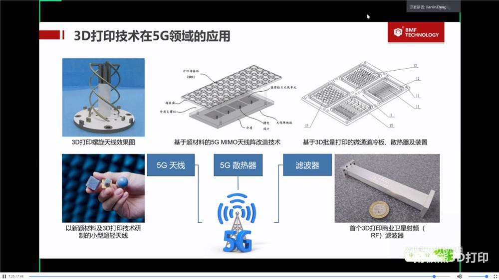 首先,周总展示了当前3D打印技术在5G领域的一些应用案例,主要包括5G天线、5G散热器、滤波器等。