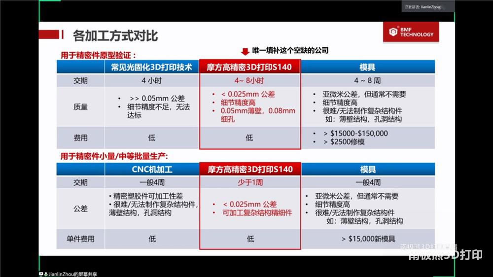 直播中,周总将摩方高精密3D打印与常见的光固化3D打印技术以及模具生产、CNC机加工等工艺进行了对比,对比内容主要包括交期、质量、费用三个方面。我们可以看出,摩方的高精密3D打印技术有着自己独特的优势。