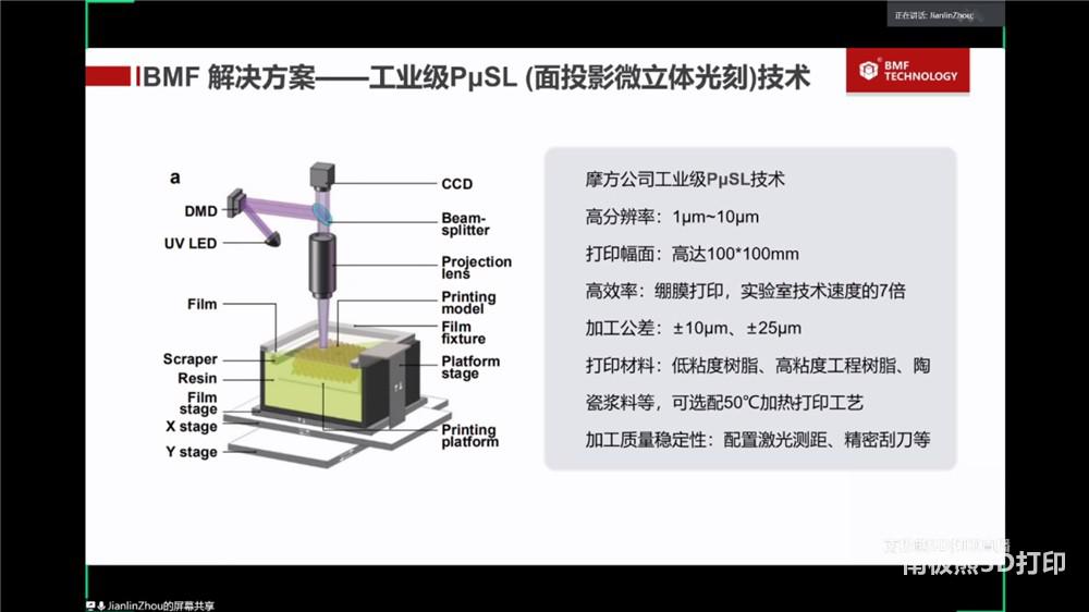 此时,你可能会很感兴趣,究竟摩方材料的高精密3D打印是一种什么样的技术,周总引出了摩方材料工业级PμSL(面投影微立体光刻)技术的原理。该系统主要包括光源、成型、运动三大部分组成。摩方材料做了很多的技术改进,使其可以达到1μm~10μm的高分辨率,打印幅面可以达到100mm*100mm,此外还能支持50℃加热打印工艺以适应更多的打印材料。