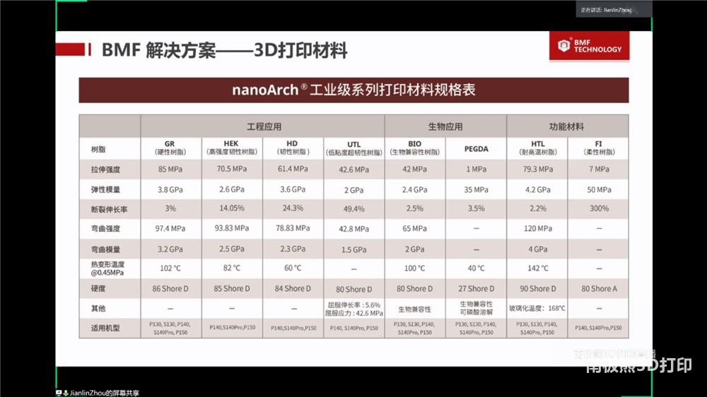 摩方材料还开发了一系列专用的3D打印材料,可以覆盖工程应用、生物应用和功能材料。周总重点解析了其中的HTL(耐高温树脂)、HKE(高强度韧性树脂)两款材料。