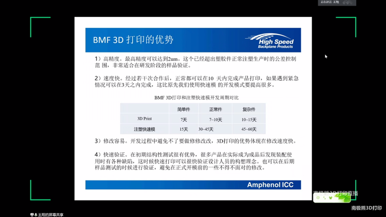 随后,安费诺集团的王翔先生介绍了安费诺的业务情况,并分享了公司在研发接插件的过程中是如何从采用快速开模转向摩方高精密3D打印的。
