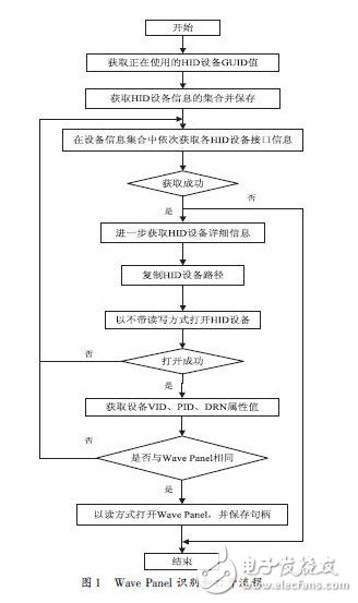 HID 设备连接到主机后,以厂商ID(VID)。产品ID(PID)和产品版本号(PVN)三项属性值的组合作为设备唯一标识.Wave Panel 的三项属性值可以从产品说明书直接获取。由于一台主机可能同时连接有多台HID 设备,所以在通讯前应用程序必须要识别并打开Wave Panel,这一过程需要调用多个Windows API函数实现。基本方法是首先获取当前与主机连接的所有HID 设备信息的集合,然后逐一枚举集合中的各设备,并比较VID.PID 和PVN 值。当三项属性值都与Wave Panel 相等时表示已经找到,调用CreateFile()将该Wave Panel 打开,并保存Wave Panel 设备句柄。该??榈牧鞒倘缤? 所示。