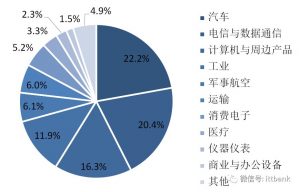 从终端产品的应用领域来看,2014年对接插件需求最大的应用领域主要有四块:汽车(22.2%)、电信与数据通信(20.4%)、计算机与周边产品(16.3%)、工业(11.9%),这四块总共占了接插件下游70%的市场,其后依次是工防航空、运输、消费电子、医疗、仪器仪表、商业与办公设备等。