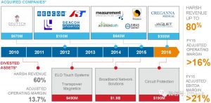 泰科电子调整产品结构的方法:收购领域内的龙头。公司在瞄准下游高景气市场后,通过收购该领域内的龙头企业进行新业务的外延拓展,打造严苛环境产品综合供应商: