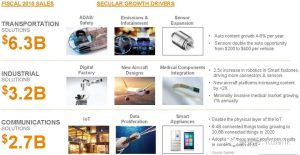 泰科电子调整产品结构的初衷:瞄准高景气度下游市场。公司目前业务分为三块:运输解决方案、工业解决方案、通讯解决方案,2015年三块对应收入分别为63.5亿美元、31.8亿美元、27.0亿美元。而公司产品结构调整至这三块也是因为这三块业务分别对应了三大高景气度市场: