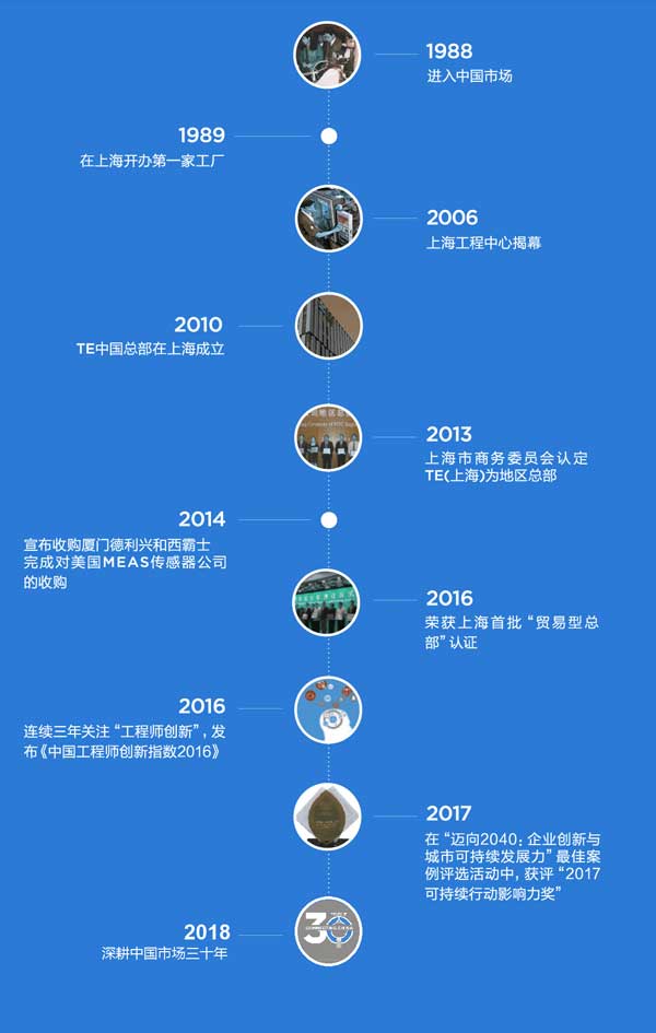 泰科电子于1988年进入中国,并于1989年在上??枇说谝患夜こ?。目前,TE中国拥有约 22,000 名员工、21个生产基地,15个销售办事处为客户提供服务。2016财年TE中国区销售总额达22亿美元,约占泰科电子年度总收入的18%。