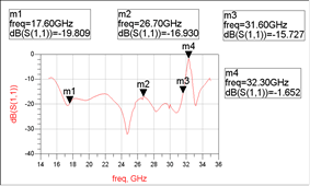 由图4的仿真曲线可以看出,在标准矩形波导BJ220工作的频带范围17.6—26.7GHz内,转接器的反射系数在-27dB以下,即驻波系数小于1.05。并且由于过渡圆孔的抑制作用,由高次模产生的谐振尖峰也被提高到35.6GHz,移出了转接器的工作频带。故通过这种改进,SMA接头认可运用于高于18GHz的场合。