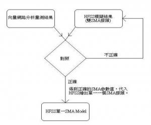 我们从网络分析仪取得双SMA接头对接的S11参数之后,接下來就要开始使用HFSS來进行SMA接头3D Model的制作,首先第一步就是先制作好SMA接头的3D Model(如图三),接着按照流程图(如图四)上的流程,进行参数的提取,测量与模拟的结果,不断的进行两者间的对照,假设模拟结果不符合测量的结果,即返回3D Model进行Teflon材质参数上的修改,最后即可得到一个正确的单一SMA接头的3D Model。