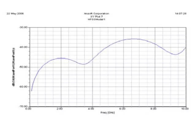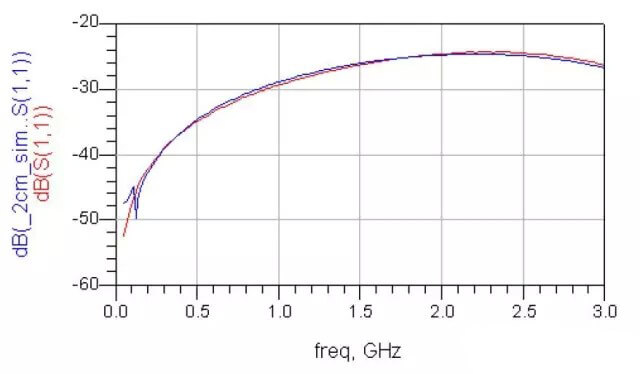 模拟的频率范围为100MHz到10GHz,而在Teflon材质Relative Permeability参数等于3.317,Loss tangent参数等于0.0035时,我们得到了与测量结果吻合的S11参数(如图五)。