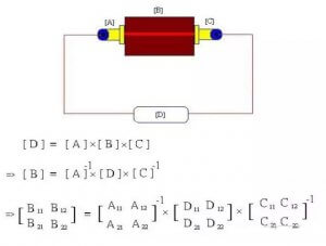 在使用HFSS提取完SMA接头3D Model的S-Parameter之后,接下來所要做的就是使用ADS (Advanced Design System )进行SMA接头参数的验证。我们可以将S-Parameter转成矩阵的表示方法(如图七),假设SMA接头参数各为[A]及[C],电路板参数为[B],量测结果为[D]即可得到图七中的式子。