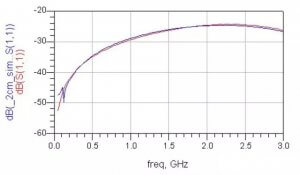 接着再将先前由HFSS所提取出的SMA接头参数,代入ADS中,即可取得模拟的结果,我们再将模拟的结果与量测的结果,进行两者间的互相验证(如图十一及图十二),从图中我们可以发现,两者间的对照可以说是非常吻合,而在2GHz的共振点,是由电路板的共振所造成的,因此从两者间的验证,我们可以得知之前从HFSS之所提取出的SMA接头参数,是正确无误的。而在往后的高速电路测试模拟中,我们即可代入此SMA 接头的参数,将SMA接头的效应考虑进去,所得到的结果将会更为正确,也将会是一个更为单纯,不包括SMA效应在里头的电路板参数。