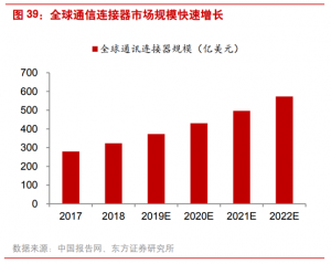 根据《中国通讯接插件市场发展研究及投资前景报告》,全球通迅领域接插件的市场规模增长最快,其中全球射频接插件市场规模预计2022年增长至78亿美元,2017-2022年复合增长率达6.5%。