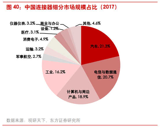 2017年中国接插件细分领域中数据与通信领域仅次于汽车,占接插件市场份额的20.7%。