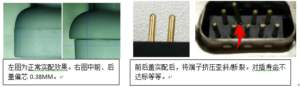 示例2:胶芯前后盖不同芯,导致端子歪斜。除了会造成示例1中的异常问题以外,还会导致冲PIN公端挤压断裂、寿命不达标等问题。
