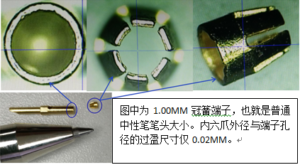 图中为1.00MM冠簧端子,也就是普通中性笔笔头大小。内六爪外径与端子孔径的过盈尺寸仅0.02MM。