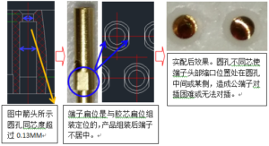 实配后效果。圆孔不同芯使端子头部缩口位置处在圆孔中间或某侧,造成公端子对插困难或无法对插。