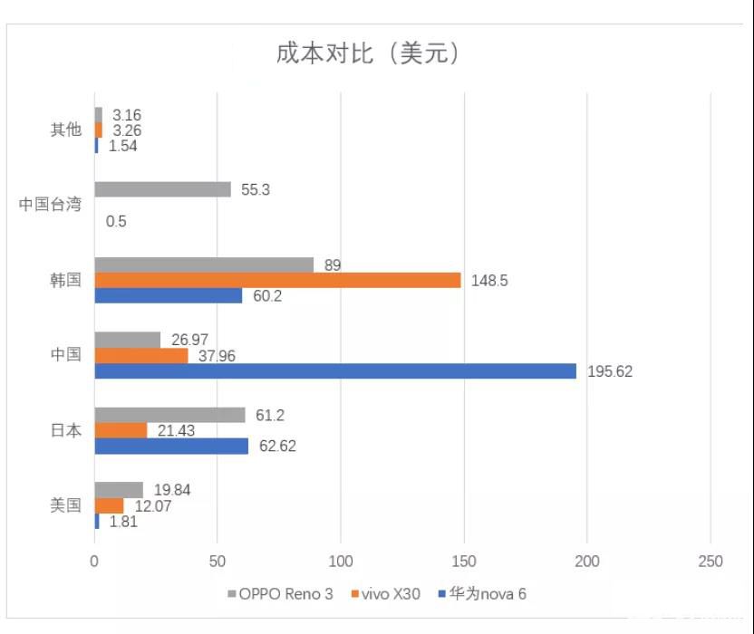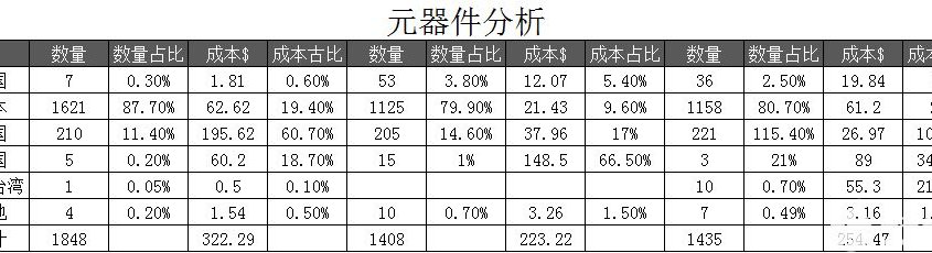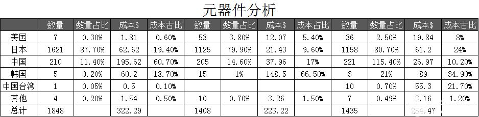 除了主控IC外,一部手机的组成还有其他一些非电子器件,提供这些器件的并非是单一的国家,而不同国家提供器件的数量和成本占比上都会不同,此次我们将从这个角度来比对这三款手机。
