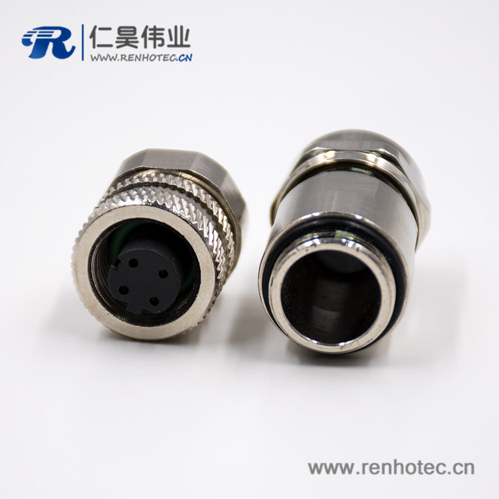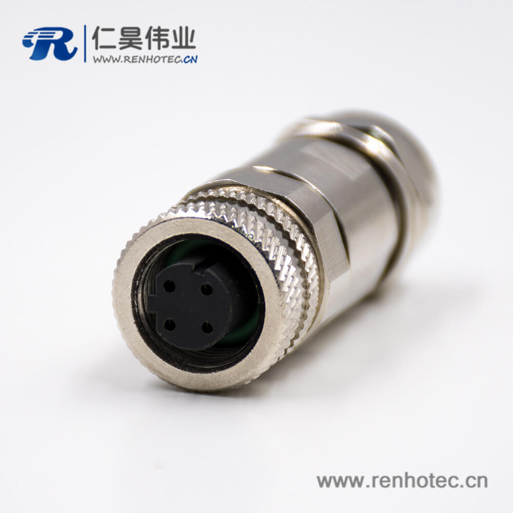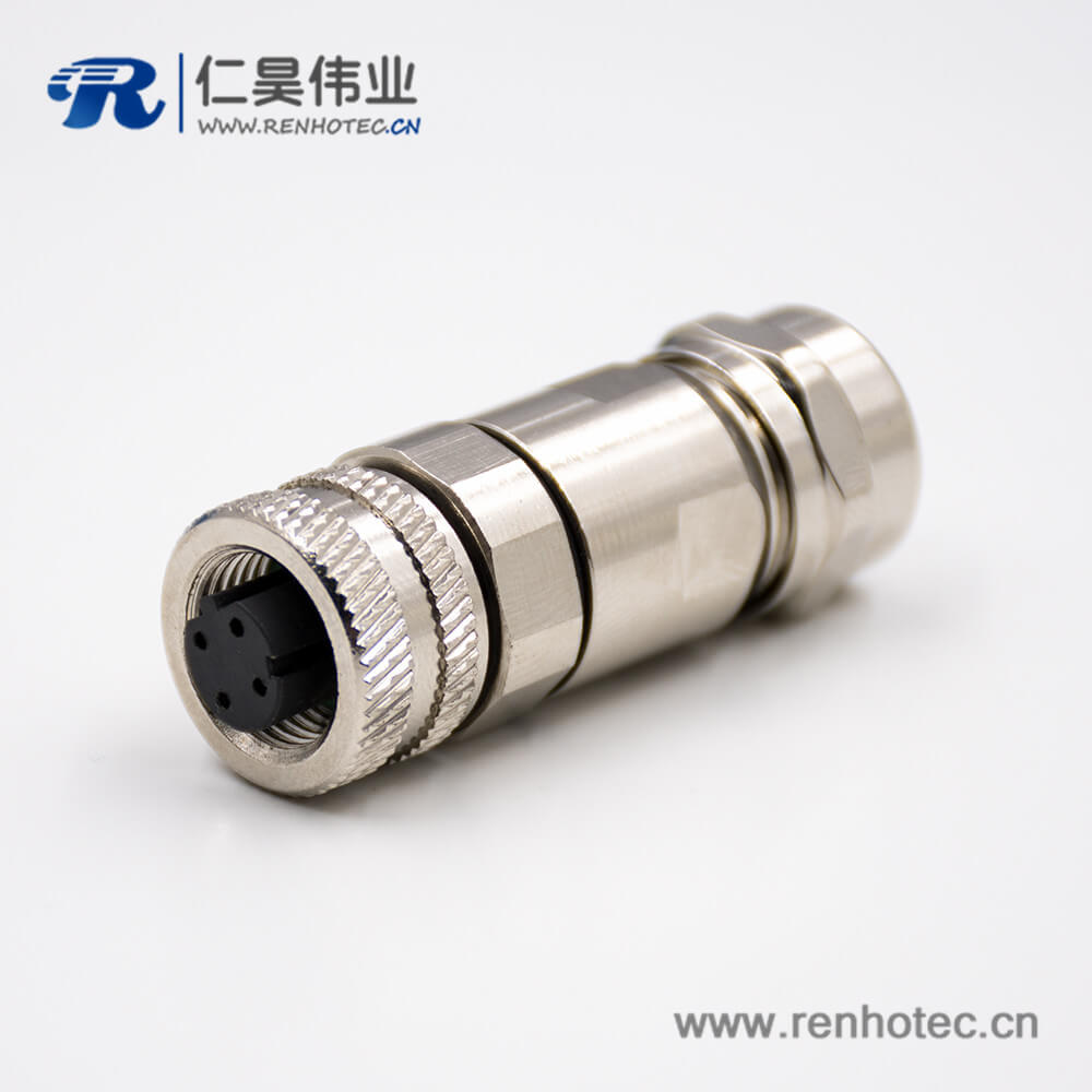 D型锁扣4芯母头直式M12组装接头接线螺丝锁线带屏蔽全金属接插件