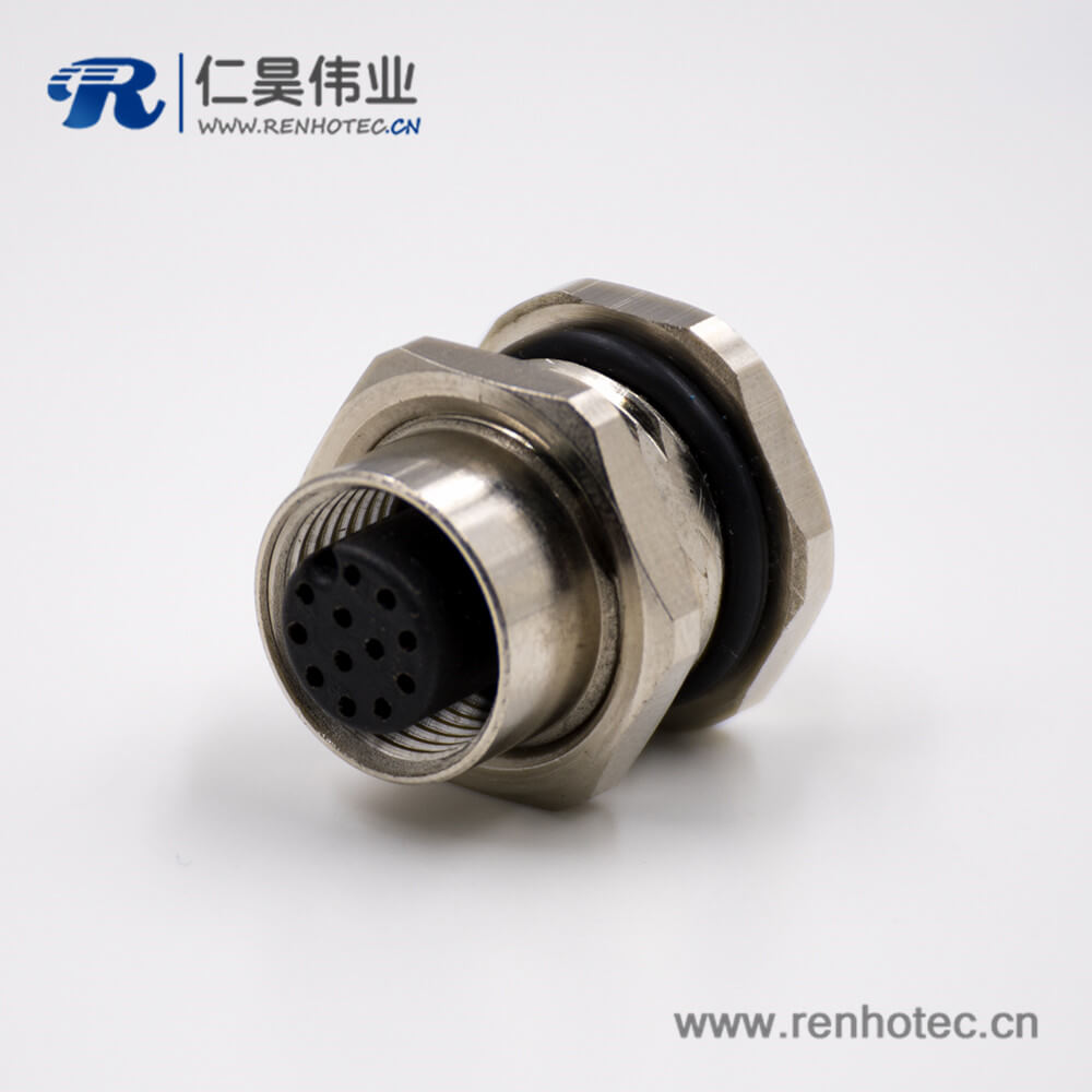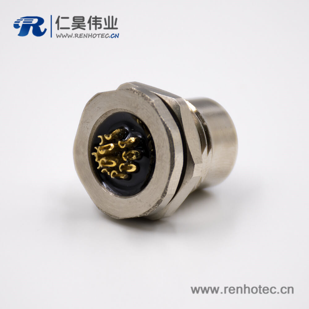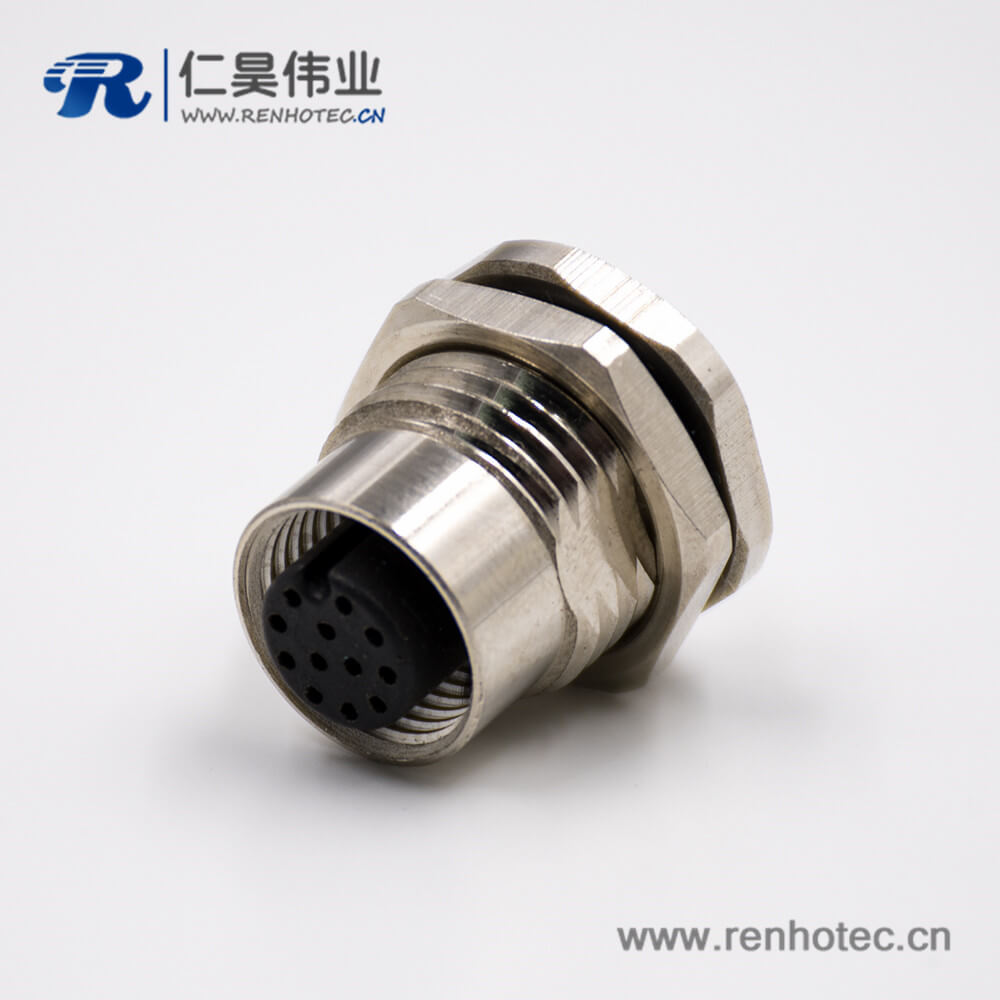 料号:M12-12-A-S-2-S-F 标签:M12板端插座,A扣,直式,12芯,母头,前锁板,接线,焊接式