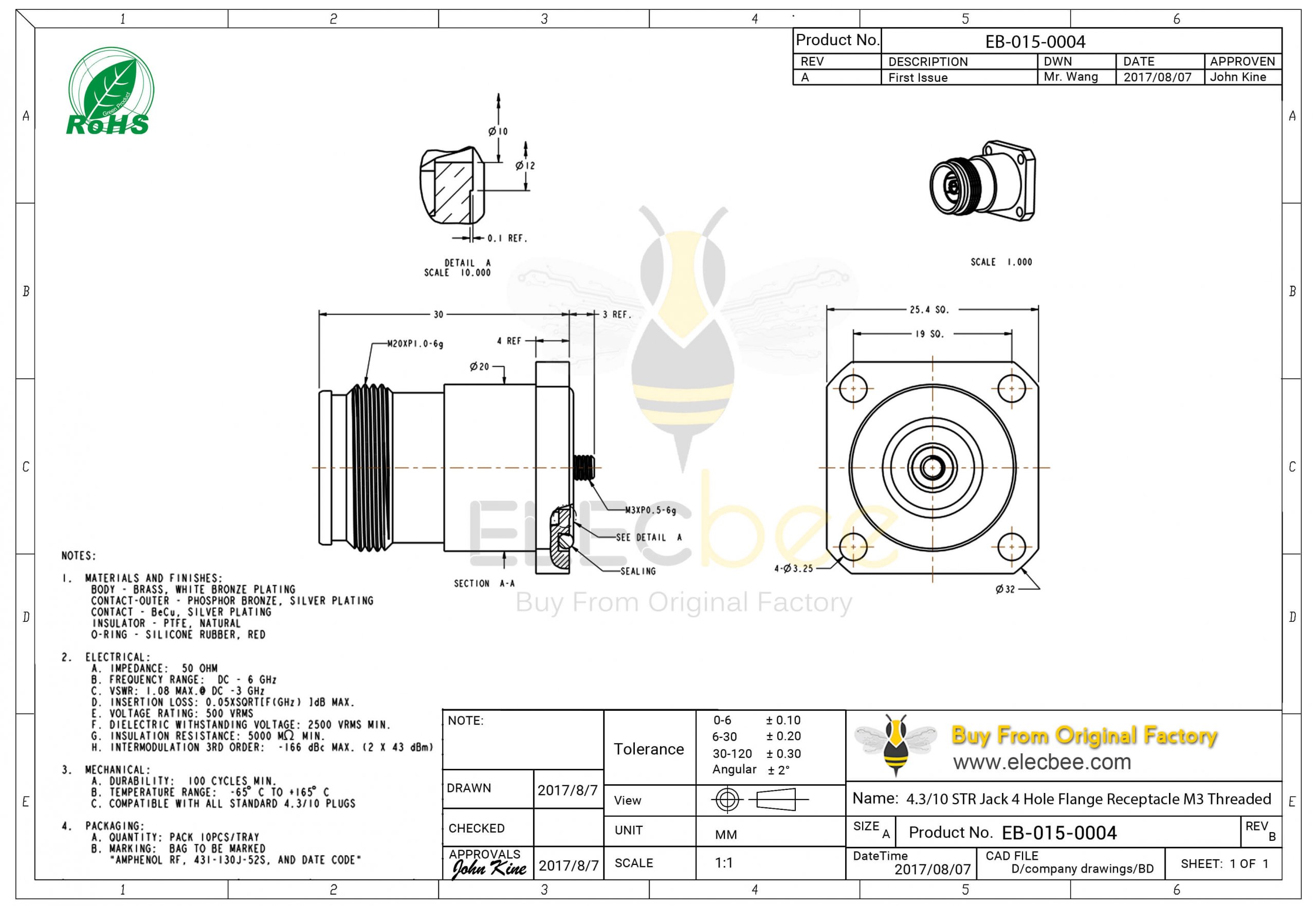 4.3/10规格接插件直式母头4孔法兰M3螺纹50欧姆