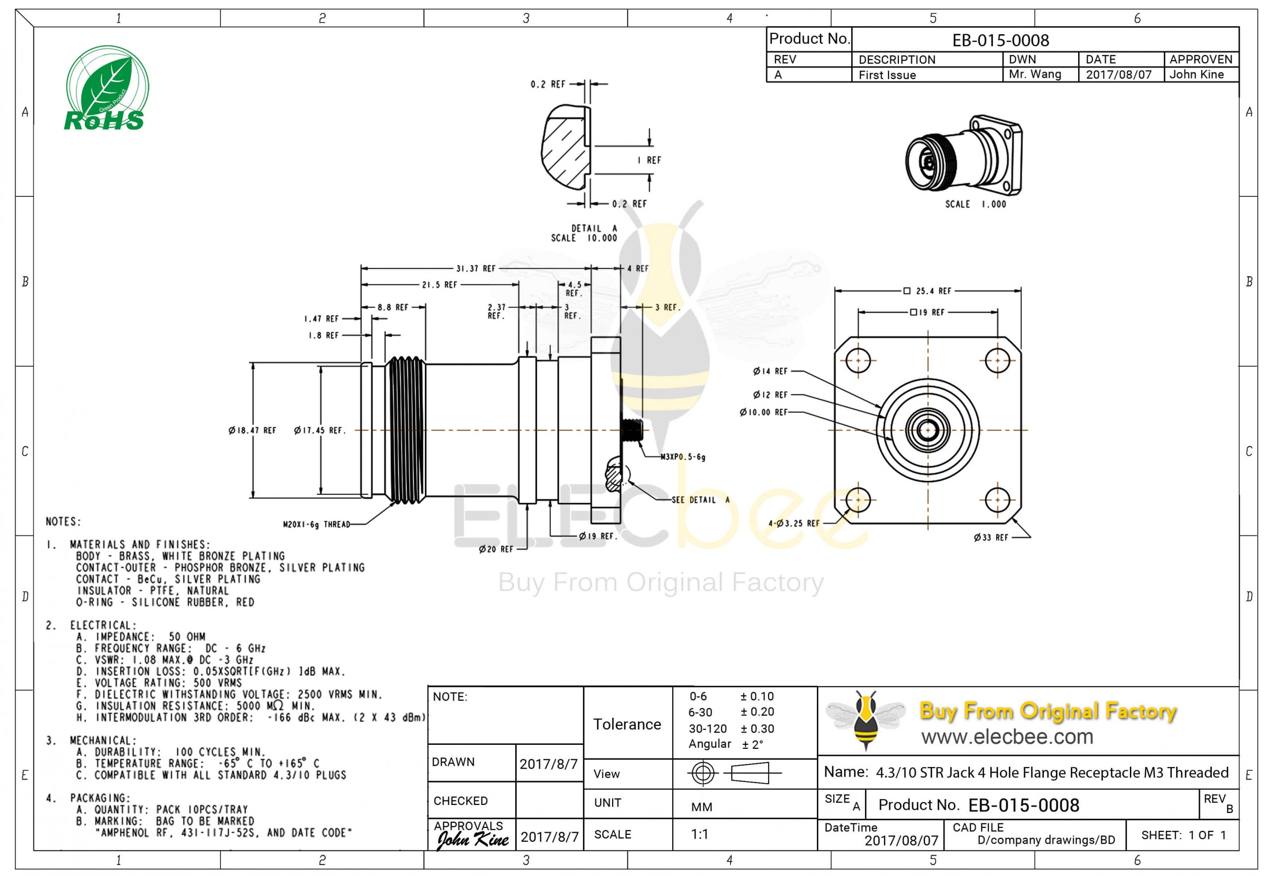 标签:?RF接插件,4.3-10接插件,直式,母头,螺母锁紧,四孔法兰,50欧姆,防水