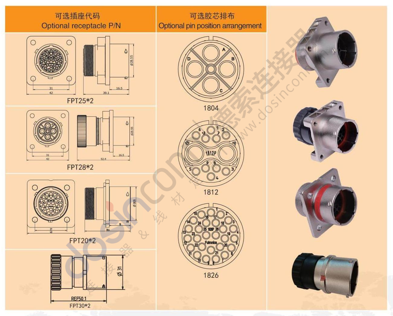 | 针脚数 | 1芯 / 2芯 / 3芯 / 4芯 / 6芯 / 8芯 / 12芯 / 14芯 / 19芯 / 26芯 / 35芯 / 50芯 |