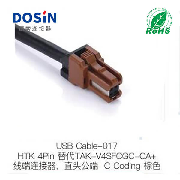 料号:USB-CABLE-017 标签:HTK4Pin线端连接器,直式,公端,棕色 扣位:C-Coding 其他: 提供尺寸、材质调整服务(定制打样)