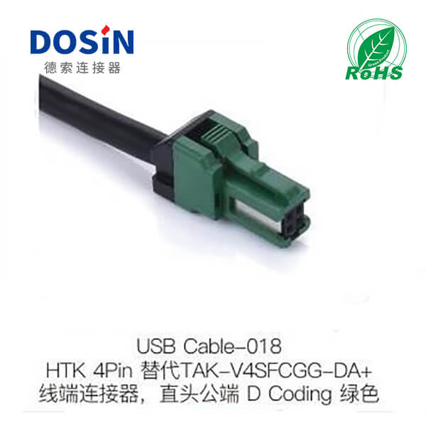 料号:USB-CABLE-018 标签:HTK4Pin线端连接器,直式,公端,绿色 扣位:D-Coding 其他: 提供尺寸、材质调整服务(定制打样)