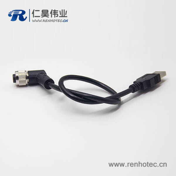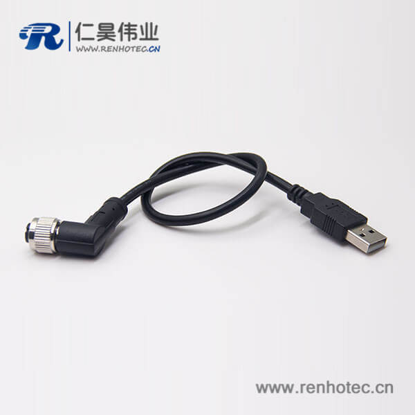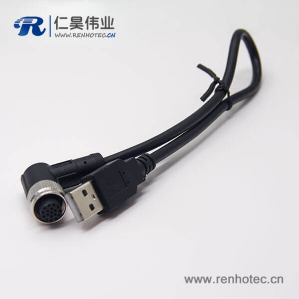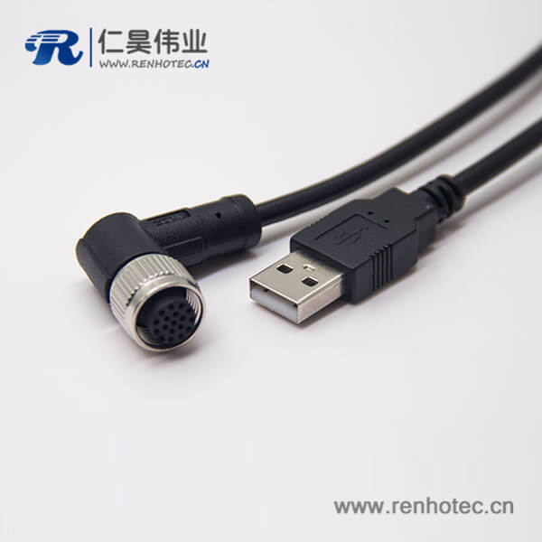 m12母头弯式17芯工业防水直式公头不带屏蔽A编码插头转USB2.01M AWG26