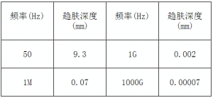 在高频应用中,射频同轴接插件也产生一些突出的现象,如趋肤效应(Skin effect):由于电磁感应, 交变电流趋向在接插件外导体的内表面和内导体的外表面传输, 频率越高趋势越明显, 当频率很高时, 95%的电流在接插件外导体的内表面和内导体的外表面3个趋肤深度(Skin depth)范围内传输. 对于铜导体来说, 1个趋肤深度与频率的关系如下:
