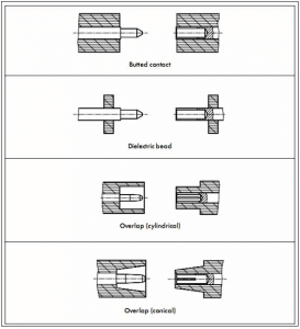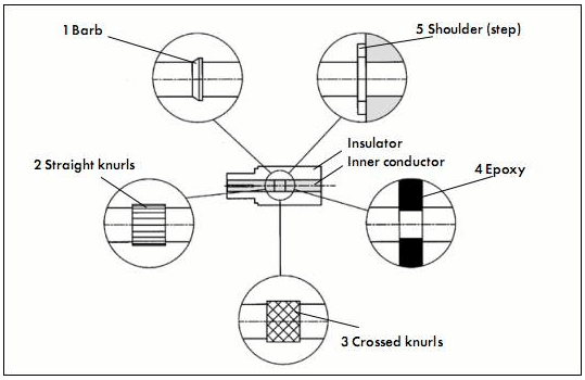 同轴线缆主要分成柔性线缆和半刚线缆两大类. 柔性线缆外导体适合用卷曲(crimp)和压紧(clamp)方式与同轴接插件连接—小的柔性线缆也常常用焊接方式与同轴接插件外导体连接. 柔性线缆内导体适合用卷曲(crimp)和焊接方式与同轴接插件内导体连接. 而半刚线缆外导体几乎是用焊接方式与同轴接插件外导体连接,也有部分采用压紧的方式—其中不少具有结构专利, 内导体主要焊接到同轴接插件内导体, 但是有些较大的波纹管的内导体是空心的,可车制成内螺纹,通过螺纹方式与接插件内导体连接.还有一种情况是: 将同轴线缆(如RG141)的内导体用作同轴接插件的内导体—只需将线缆与接插件的外导体连接.