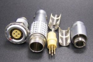 绞线插针是由三根纯铜线作内圈,七根铍青铜线作外圈,内外圈反向绞合,两端熔焊,插针中部凸起,凸起部分外切园的直径大于接触部分的插孔内直径,工作时因受力产生压缩变形和轴向旋转伸长,并与插孔形成七点紧密接触。它独特的结构特点使其具有良好的弹性和接触性能以及特殊的耐振动、抗冲击能力,试验证明它的抗冲击加速度(三方向3000次)可达150g。