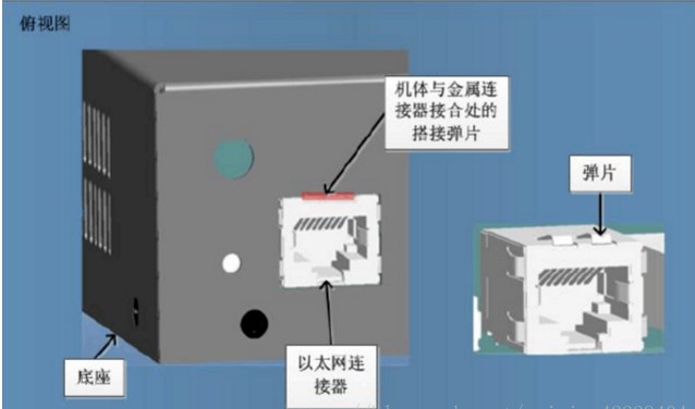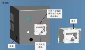 (2)?机体与百兆以太网金属接插件之间的接合处要增加弹片,使两者接合时保持良好的导电性能。具体搭接方式如上图所示: