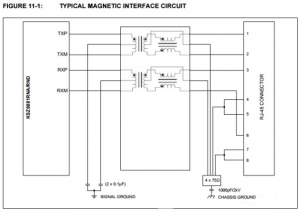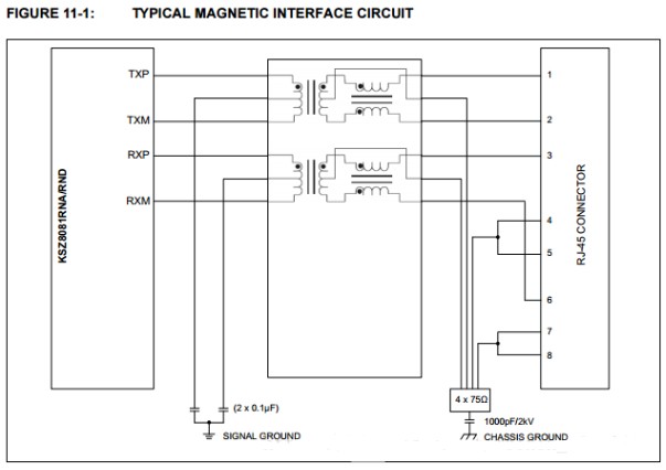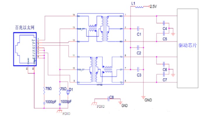 网络变压器虽然带有隔离作用,但是由于变压器初次级线圈之间存在着几个pF的分布电容;为了提升变压器的隔离作用,建议在变压器的次级电路上增加对地滤波电容,如电路图上C4-C7,此电容取值5Pf~10pF。