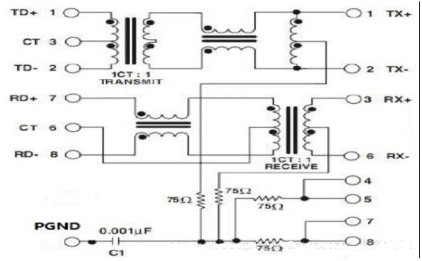 为了抑制RJ45接口通过电缆带出的共模干扰,建议设计过程中将常规网络变压器改为接口带有共模抑制作用的网络变压器,此种变压器示意图如下。